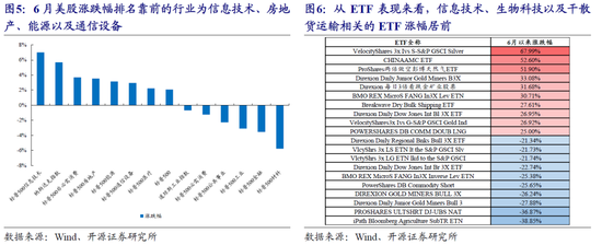 美股5月表现不佳的信息技术板块和通信设备板块6月明显反弹,而5月表现出色的材料、金融与工业板块则大幅回调。美国ETF中信息技术、生物科技以及干散货运输相关的ETF涨幅居前,而黄金开采以及做空信息技术的ETF排名靠后。