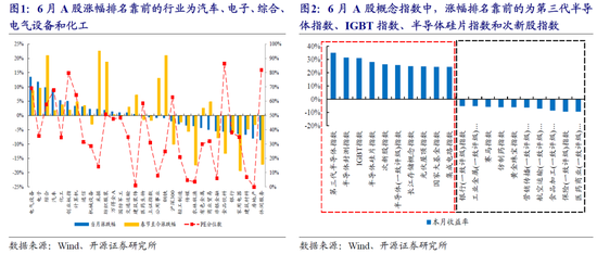 6月A股板块表现分化明显:电子、电气设备、计算机、通信等新兴成长板块涨幅排名居前,而大消费板块(食品饮料、农林牧渔、医药)、金融板块(银行、非银、房地产)整体偏弱。此外,周期性行业内涨跌互现:化工、采掘表现较强,而钢铁、有色有所回调,表明投资者对未来通胀走势存在分歧。从概念指数表现来看,涨幅排名靠前的指数集中在半导体相关领域,跌幅较大的集中在金融、医药和食品加工。板块表现和概念指数表现基本保持一致。