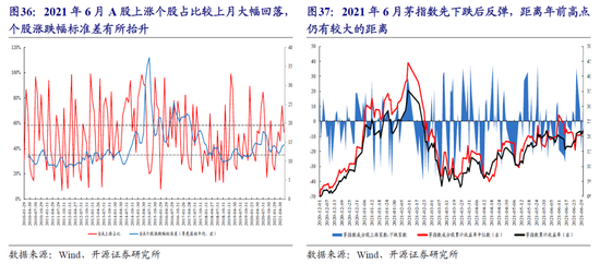 2021年6月A股上涨个股数占比大幅回落,全A月度区间收益率为正的个股占比从5月的75%下降至53%,个股涨跌幅的标准差继续扩大,A股的扩散效应有所减弱,分化增强。茅指数6月先下跌后反弹,距离年前高点仍有较大的距离。