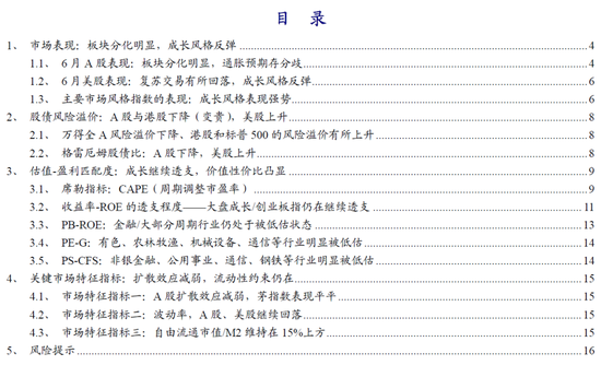 【报告导读】6月A股板块分化明显,通胀交易仍存在分歧,主要体现在周期板块涨跌互现,然而以大盘成长和创业板指为代表的成长风格指数仍在继续透支未来,透支水平甚至已经超过了2月初时的水平。值得关注的是美国ETF中与干散货运输相关的ETF涨幅居前。整体来看,部分周期投资者可能已经发现了结构性向上的信号,而全市场对于通胀的持续可能还没做好准备。市场流通市值扩张速度正面对未来流动性的约束,估值压力不得不防。