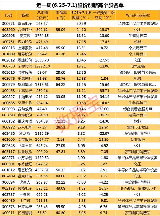 行情上,32只股票的股价创下历史新高,不少行业龙头位列其中,如爱美客、宁德时代、隆基股份等。板块来看,受益于下游芯片短缺和光伏的高景气,半导体产品与半导体设备行业上榜个股多达7只,化工行业6只。机构预测方面,多数个股最新价已超出机构目标,爱美客、宁德时代均逾12%;顺络电子、南京银行等4股仍有10%以上的看涨空间。