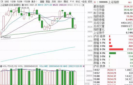 牛眼君总结:今日大盘小幅反弹,成交量基本持平,从盘面来看,上证综指下方触及了60日均线和半年线,这些位置有支撑作用,多方在此有所抵抗是正常的。不过,因为多个指数都有日线的顶部结构,调整不会在短期内结束,今天多方的抵抗只是下跌途中的抵抗而已,不会有多大力度,短暂抵抗后,指数还将再度下行。