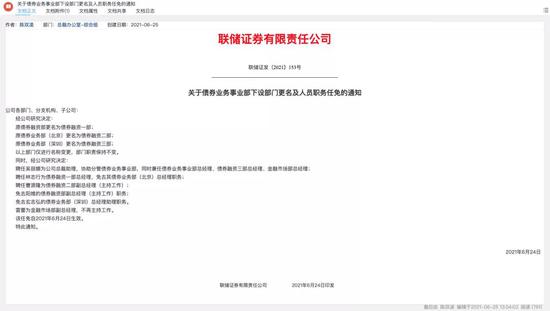 据行家了解,6月24日,联储证券下发了一系列部门部门和人事变动。