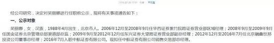 吴女士生于1988年4月。自2006年起,她历任华西证券紫竹院路营业部区域经理,国金证券北京管理总部渠道部总监,东兴证券大望路营业部副总经理,北京融鑫世邦投资公司(简称:融鑫世邦)董事总经理,以及中航证券销售交易部总经理。