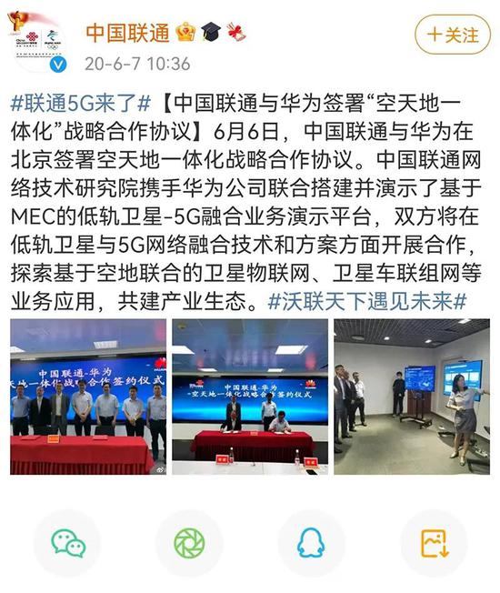 早在去年6月,中国联通官方微博就曾发布消息表示,中国联通与华为在北京签署空天地一体化战略合作协议。