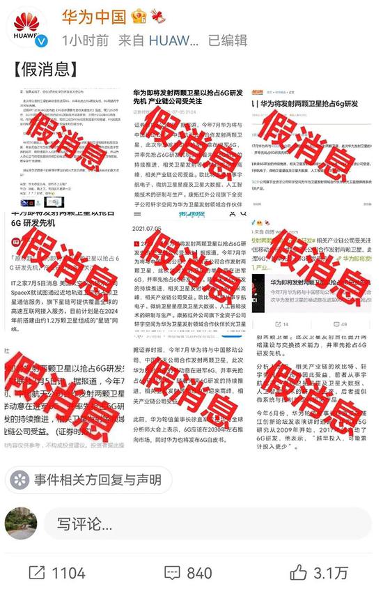 对此,华为于7月6日上午通过官方微博作出回应:假消息!