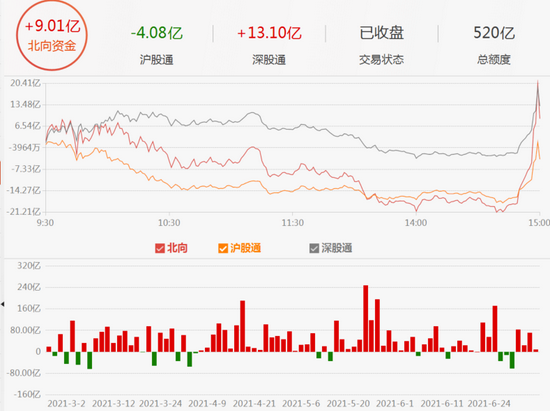 根据choice数据,7月8日,北向资金净流入9.01亿。其中深股通净流入13.1亿,沪股通却净流出4.08亿。