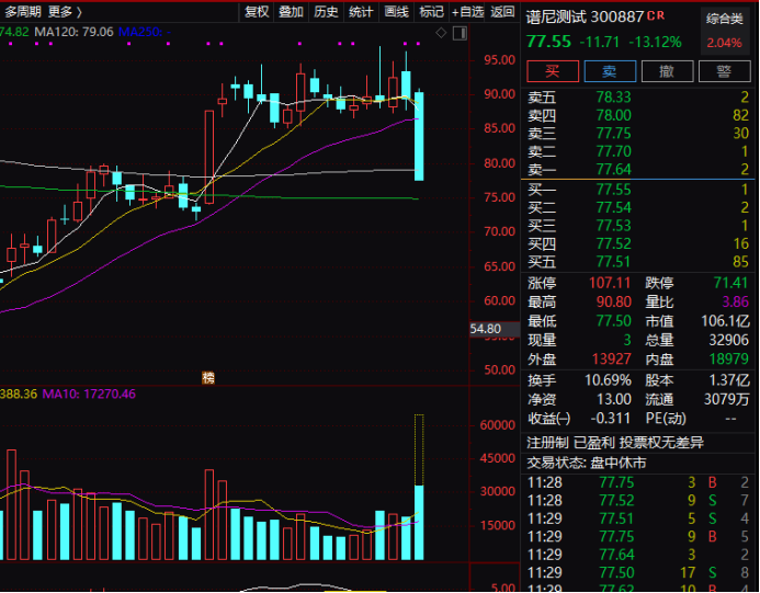 昨晚披露中期业绩大幅预增的谱尼测试今天上午股价也出现暴跌,截至上午收盘跌超13%。