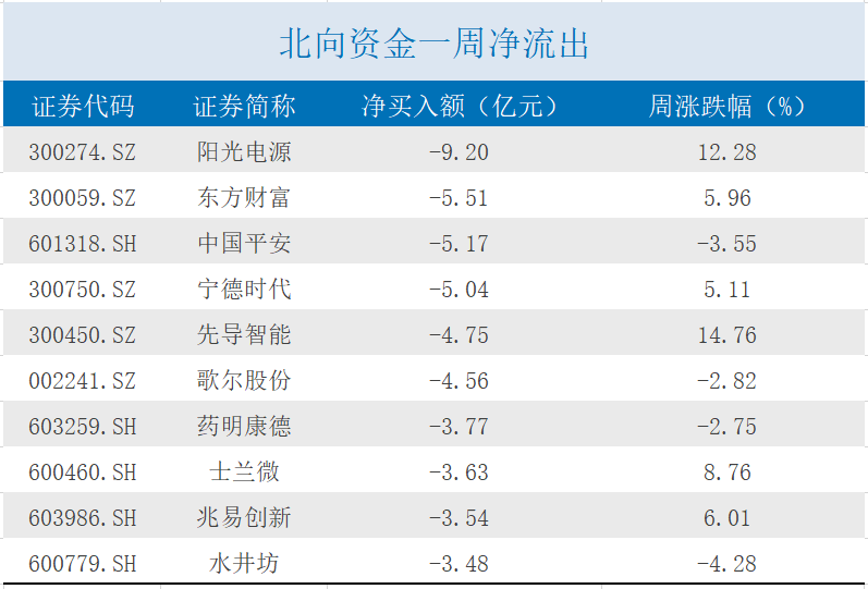 净卖出额居前三的是阳光电源、东方财富、中国平安,净卖出额分别是9.2亿元、5.51亿元、5.17亿元。