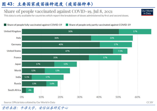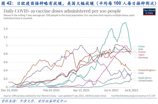目前来看,疫苗对变种病毒传播依然有抑制作用,但发达国家全民免疫仍需要时间。美疾控中心一项研究表明,有93%的新冠病例出现在接种率低于40%的地区。但从英国的情况看,德尔塔变种病毒传播能力明显更强,对疫苗接种率要求也将更高。目前发达国家疫苗接种情况远没有几个月前预期那么乐观,主要原因在于随疫情好转,群众疫苗接种意愿下降,疫苗接种速度回落,管制放松,并引发新一轮疫情传播。对于一些中低收入国家而言,疫苗短缺的问题近期仍未有改善。