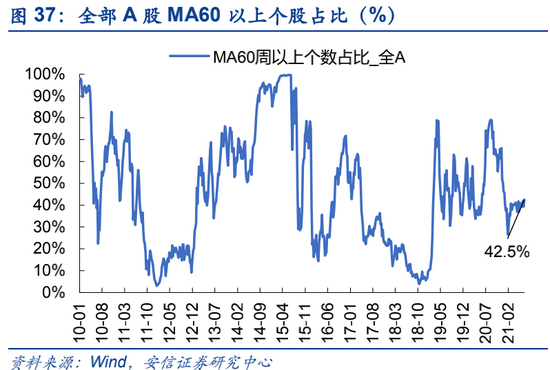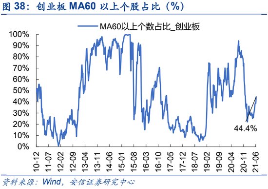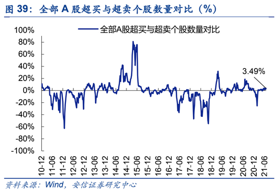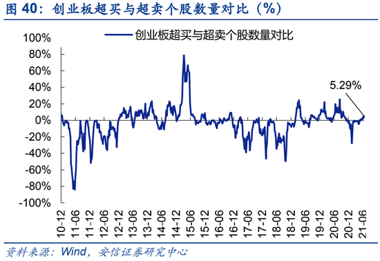 本周创业板表现相对较强。当前市场强势个股数量占比39.2%,较前一周大幅回升3.3个百点;超买个股与超卖个股之差占比3.5%,较前周回升1.6个百分点。创业板来看,强势个股数量占比44.4%,较前一周大幅回升5.7个百分点;超买个股与超卖个股之差占比5.3%,较前周回升2.8个百分点。