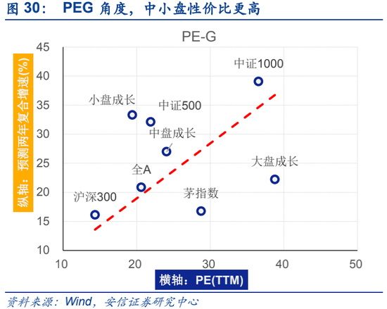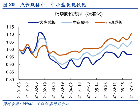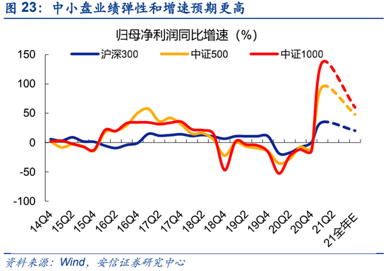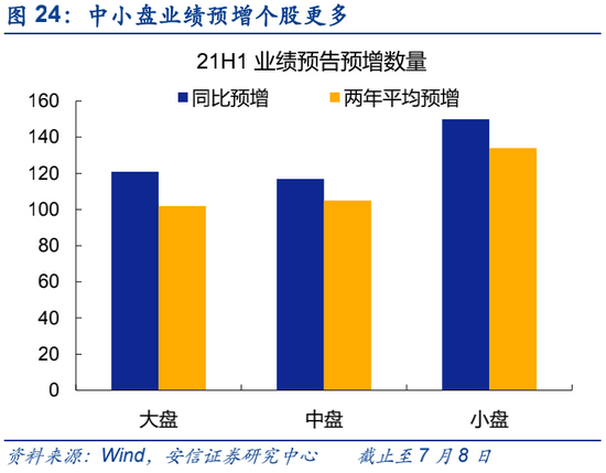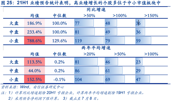中小盘企业业绩修复动能更强,具有高业绩弹性和真实增长的企业更多位于中小市值板块中。从一季报来看,沪深300、中证500和中证1000业绩增速分别为34.9%、95.5%和137.3%;Wind一致预期的全年预期增速分别为20.3%、47.9%和60.0%,中小盘企业呈现出更高业绩弹性。从半年报业绩预告来看,为了剔除去年同期低基数影响,更好反映真实增长情况,我们采用预告净利润的下限计算两年平均增速。在大中小盘中,两年平均增速大于50%的个股数量分别为46、61和69,两年平均增速大于100%的个股数量分别为23、29和47;高业绩增长的个股多位于中小市值板块中。