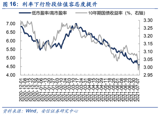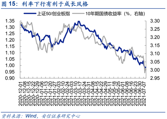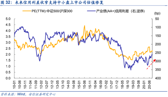 未来一段时间的货币和信用环境也将支持中小盘成长股估值修复。历史上看,中小盘相对估值与信用利差呈现明显负相关;其背后的原因在于,信用风险溢价被纳入了中小企业估值的分母端。17年后的金融去杠杆和“打破刚兑”期间,也正是信用快速走阔、中小盘相对估值大幅收缩期间。19年包商银行事件、20年永煤事件以及今年上半年市场对信用收缩的悲观预期使信用利差整体维持高位。尚不论未来货币政策是否进一步宽松以及无风险利率的走向,就当前政策对于经济状况及信用事件的态度上看,未来一段时间信用利差有望稳步走低,从而支持中小盘上市公司估值修复。