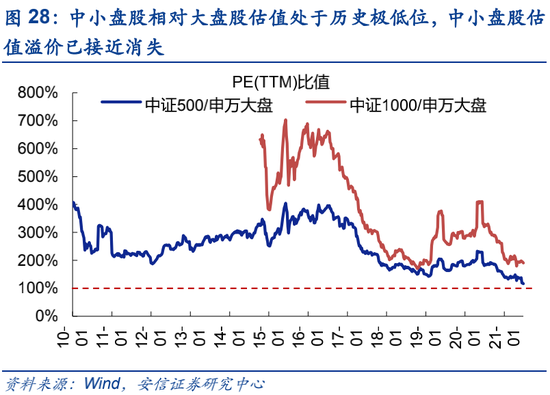 中小盘股相对大盘股估值处于历史极低位。15年后中小盘业绩三年暴雷、16年供给侧改革行业加速出清、17年陆股通加速流入白马股、18年影子银行强监管以及20年以来的大盘成长行情,中小市值企业一路跑输大市值企业,市场风格演绎趋于极端。市场从对中小市值企业的成长性溢价向转向了大市值企业的稳定性溢价,中证500和中证1000对于大盘股的PE(TTM)相对值目前处于十余年以来的最低水平,绝对值已接近于1,中小盘估值溢价已接近几近消失。实际上,从海外发达市场经验来看,这一现象实际上并不常见,小盘股往往具有估值溢价,大小盘风格总体上呈现来回切换,并非某类公司永远占优。对于一些新兴行业而言,竞争格局也远未达到出清阶段,没有一家龙头不是从中小企业成长而来。
