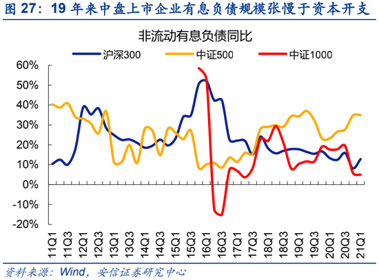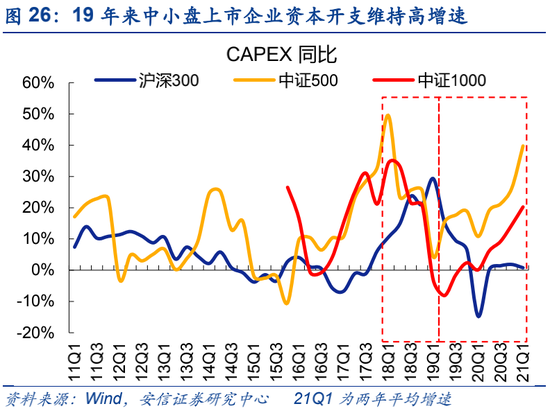 部分行业中小盘企业盈利增长与弹性来自于行业景气与自身经营状况的切实改善。企业资本开支能够良好反映企业当前的经营状况和对未来的信心。18年金融去杠杆,中小盘企业融资和经营环境不佳,资本开支增速大幅下降,而大型上市企业加速扩产并购,提升市场份额。但19年以来,国家更多支持新兴产业,中小盘上市企业资本开支提速,在疫情期间依然势头不减,而大型上市企业增速明显回落。同时,中小盘上市企业有息负债规模扩张慢于资本开支,或反映企业很多依靠内生增长,而非盲目举债扩产。随产能陆续投放,中小盘上市企业中短期受益于疫情环境下各行业普遍存在供需缺口,同时也有部分企业的盈利能力在发生中长期改善甚至质变。