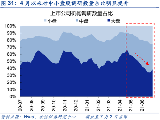近期机构投资者对中小盘成长股关注度也在明显提升。龙头躺赢已成为β策略,而中小盘企业绝对和相对估值均处于历史低位,投资者开始从中小盘企业寻找α机会。从近期的机构投资者对上市公司调研的情况看,对中小盘上市公司调研数量的占比由40%左右提升至近期的70%左右。从近期市场表现上看,部分中小盘个股一旦出现基本面和成长性的改善甚至反转,将迅速形成市场共识并持续上涨。