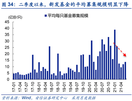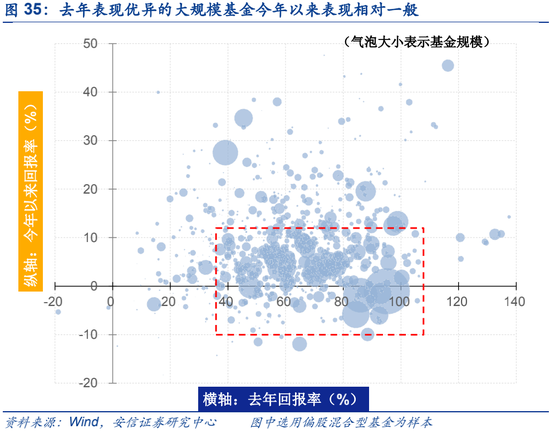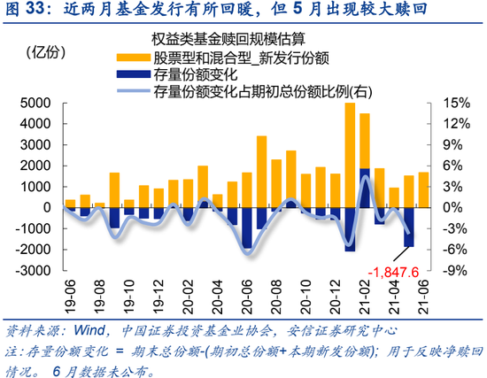 而当前来看,这一逻辑似乎已有一些变化:1)二季度以来新发基金较去年已有明显降温,新发基金的募集规模降至平均11亿/只左右,较一季度25亿/只明显回落;2)5月权益类公募基金出现明显赎回,或与近期基金整体净值回升有关,公募基金为市场带来的净增量资金实际上十分有限。3)进一步观察可以发现,去年表现优异的大规模基金今年以来表现相对一般,未来在赎回和业绩压力下,对部分大盘股可能存在调仓行为,从而产生股价压力。