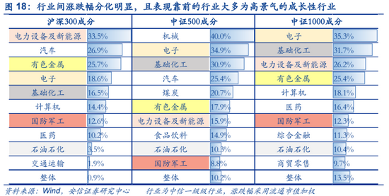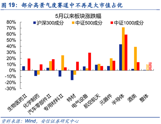 从5月以来的市场表现上看,成长风格依然强势,但大市值因子逐渐失效。通过比较不同不同行业和市值规模下的板块表现可以发现,部分高景气度赛道中已不再是龙头占优,大市值因子逐渐失效。我们横向对比了沪深300、中证500和中证1000中各个细分赛道上的股价表现,一方面,在不同市值规模下,涨幅居前的行业依然为高景气的成长性行业;另一方面,在医药、半导体、新材料、白酒等细分赛道中,中小市值个股出现明显跑赢。