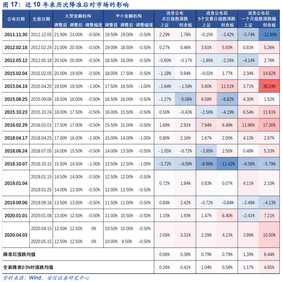 从历史上看,降准对市场的影响方向并不是次次相同,从短期来看,1%的降准幅度往往引发市场对于经济下行的担忧从而引发市场短期走弱,0.5%的降准幅度则往往带来更多的宽松预期,市场整体中性偏强。从1个月的视角来看,降准后市场通常小幅走高,对以创业板为代表的成长股影响尤为明显。