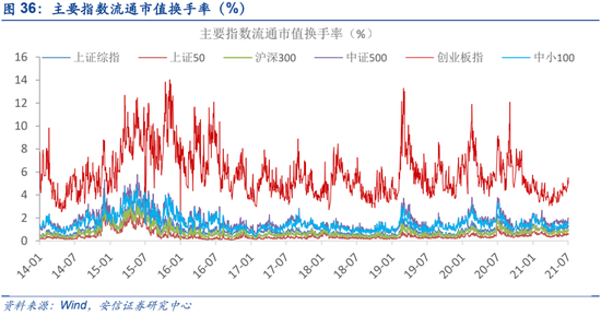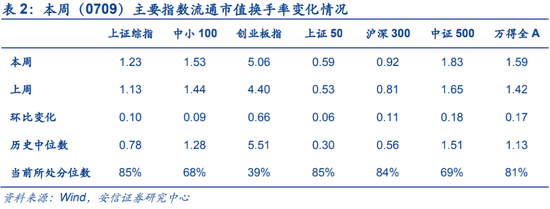本周市场交易活跃度明显提升。本周上证综指,中小100,创业板指,上证50,沪深300,中证500,万得全A的流通市值换手率分别为1.23%,1.53%,5.06%,0.59%,0.92%,1.83%,1.59%,分别较前一周变动0.10,0.09,0.66,0.06,0.11,0.18,0.17个百分点,分别处在85%,68%,39%,85%,84%,69%,81%分位数水平。