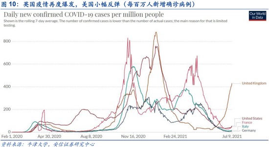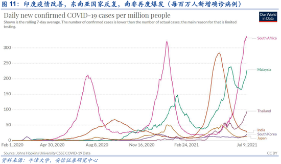 从全球视角来看,欧美疫情在秋季可能再度卷土重来,为全球经济复苏蒙上了一层阴影。受德尔塔变种病毒和管制放松的影响,近期英国、南非和东南亚国家疫情再度爆发,美国新增病例也出现小幅反弹。近一周,英国日均确诊病例飙升至2.8万例,且有向其他欧洲国家扩散的态势;南非疫情持续恶化,马来西亚、印尼、泰国等东南亚国家疫情依然严峻。