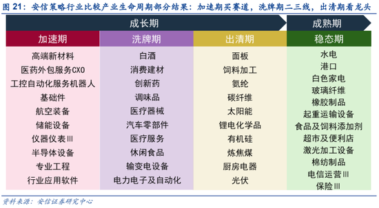成长股投资需关注产业生命周期:加速期买赛道,洗牌期二三线,出清期看龙头。从产业生命周期的角度看,投资龙头并非总是占优策略。对于处于加速期的行业,如CXO、工业软件、高端制造设备等,市场整体维持快速扩张或国产替代需求强烈,行业参与者普遍获得成长红利。当行业扩张速度有所放缓,参与者众多但竞争格局远未固化,如消费建材、调味品等,行业进入洗牌期,二三线企业借助技术路线、产能投放、管理优势和渠道下沉有望提升市场份额,建立企业品牌和竞争优势,同时估值相对低、成长潜力相对大。当行业扩张速度进一步放缓,周期性加强,市场参与者需借助抢占市场份额获得竞争优势,如面板、光伏等,龙头借助成本和规模优势保持成长性,行业竞争格局逐步明朗化,市场份额逐步向龙头集中。