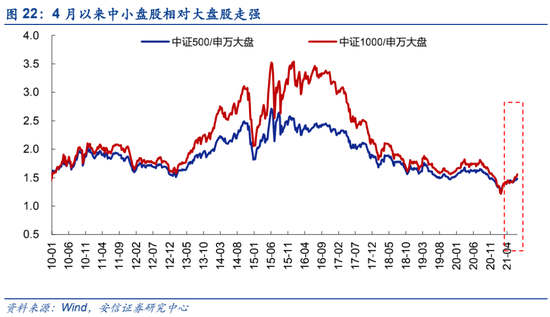 4月以来,龙头躺赢策略与大盘因子开始逐渐失效,以中证500和中证1000为代表的中小盘相对于以沪深300和茅指数为代表的大盘龙头开始获得超额收益。我们认为,其背后既有基本面因素的支撑,也是市场开始对部分中小盘价值重估和深度挖掘。此外从增量资金的角度,二季度以来,去年大盘股“流动性溢价”的逻辑或有所变化。站在当前,我们不轻言风格切换,也不否定部分行业龙头的成长趋势,但部分优质中小盘经营状况确有明显改善,其相对于大盘股的估值修复确有较大空间,在当前宏观和市场环境下具有更高的胜率和赔率。建议投资者战略上加强中小盘的关注,战术上从自下而上的角度,挖掘景气赛道上的优质企业。