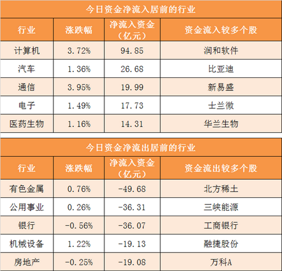 28个申万一级行业中,计算机等行业实现资金净流入,其中计算机行业净流入94.85亿元居首。