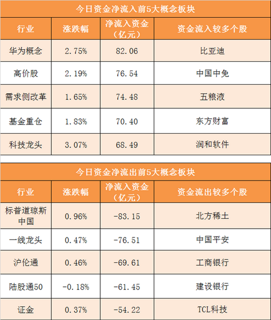 概念板块方面,今日华为概念、高价股、需求侧改革、基金重仓等概念板块资金呈现净流入,其中华为概念净流入82.06亿元居首。