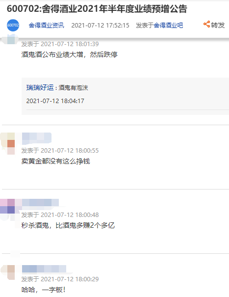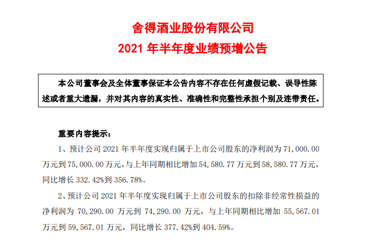7月12日晚,舍得酒业(维权)发布业绩大幅预增公告。