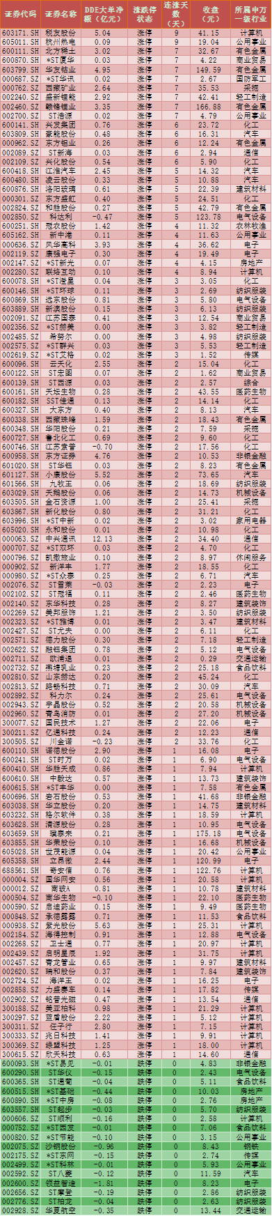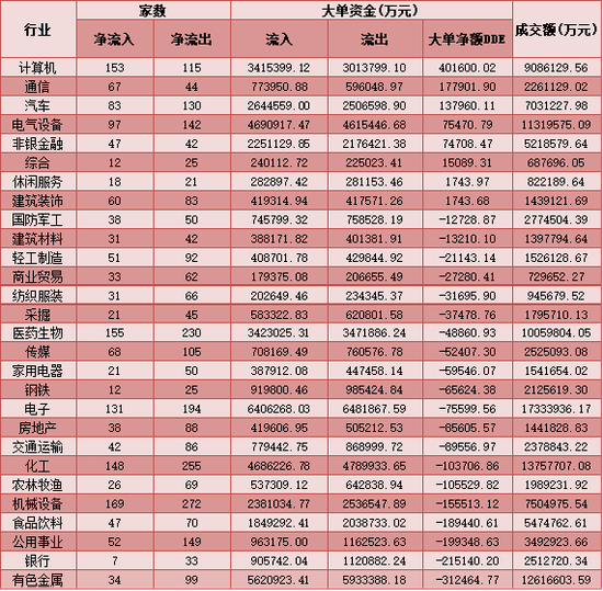 从资金层面看,周一市场呈大单资金净流出态势,为连续第3个交易日净流出,周一DDE大单净额流出达101.56亿元。行业方面,有8类行业呈净流入,前三位分别为:计算机(401600.02万元)、通信(177901.90万元)、汽车(137960.11万元)。值得关注的是,资金流入前三位的行业均属科技密集型领域。