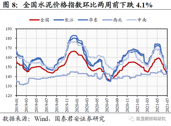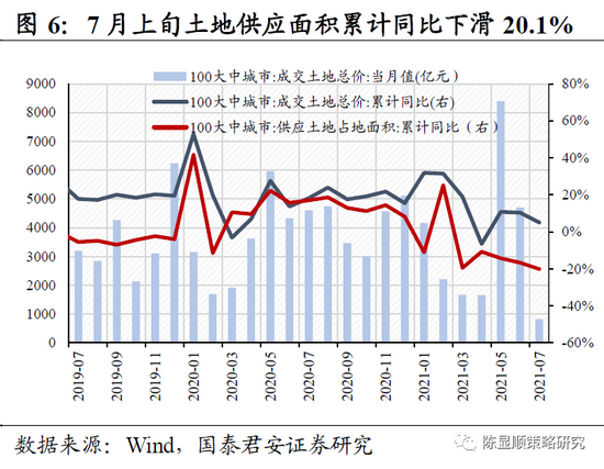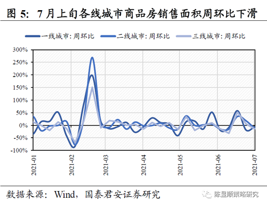 地产销售:多地加强二手房监管,商品房销售回落。据高频数据统计,截止7月11日,一、二、三线城市商品房当月成交面积周环比分别下降6.9%、11.9%、13.9%,下滑较为明显。土地方面,“两集中”后市场量缩价涨,7月上旬土地成交面积、成交总价累计同比分别为-20.1%、5.04%。央行降准一定程度可缓解房企融资压力,尤其是三条红线绿档类企业,但房企增厚土储可能加剧土地市场的竞争和溢价,房企拿地利润率难以得到系统性的改善。近期多地加强二手房管控,北京西城区强调严禁炒作学区房、西安建立二手房成交参考价格发布机制、上海市房管局规定未通过价格核验二手房源不得对外发布等,政策的陆续出台反映当前政府对房地产市场调控的收紧。