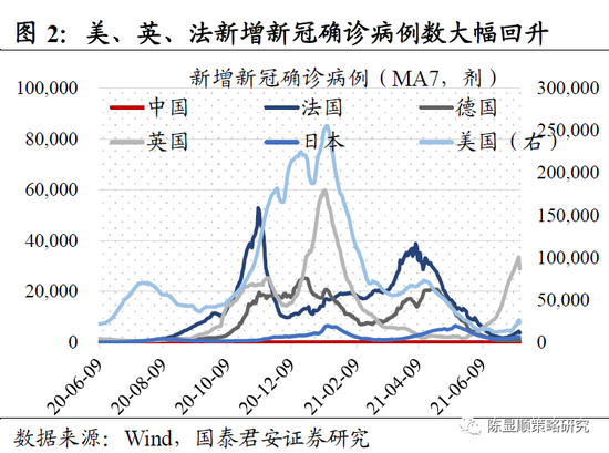 德尔塔毒株蔓延带动全球疫情反复,美、英、法新增确诊人数大幅反弹。变异新冠病毒德尔塔毒株正以极快的速度席卷全球,导致新冠确诊病例和死亡病例激增。据世卫组织披露,当前德尔塔毒株已出现在至少104个国家和地区,预计其很快将成为全球流行的主导新冠病毒。相比普通毒株,德尔塔的传染性更强,且疫苗对其的保护率有一定幅度的下降。截至7月13日,美、英、法每日新增病例数七日均值分别为26446人、33529人、4324人,环比半月前大幅上升99.7%、89.9%、135.7%。