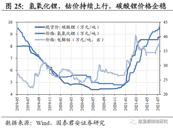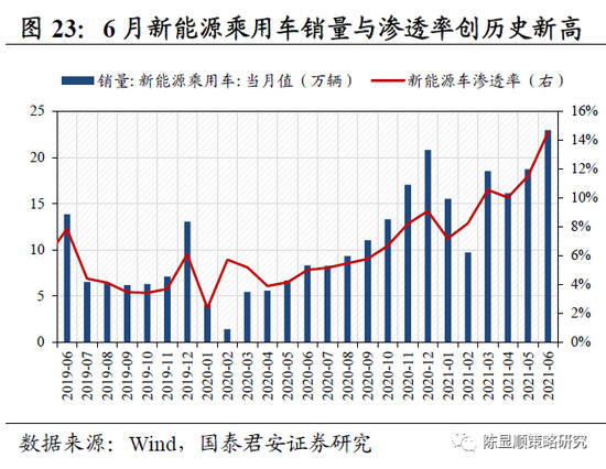 新能源车:6月新能源乘用车销量与渗透率创历史新高,原材料钴价大幅上升。乘联会数据显示,6月我国共销售新能源乘用车22.3万辆,同比增长170%,零售渗透率达14%,双双创历史新高。动力电池装车方面,6月我国动力电池产量共计15.2GWh,同比增长184.3%,环比增长10.2%。其中三元电池产量7.4GWh,占总产量48.4%,同比增长133.6%,环比增长47.1%;磷酸铁锂电池产量7.8GWh,占总产量51.2%,同比增长256.4%,环比下降11.3%。受益于下游需求的持续旺盛,氢氧化锂、钴价持续抬升,碳酸锂受制于供应充足,价格环比持平。