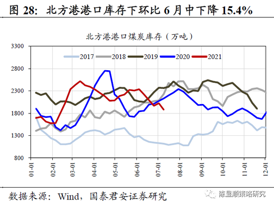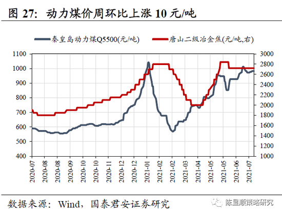 煤炭:市场预期逐渐修复,短期煤价或迎反弹。前期受行业供需边际放松影响,煤炭价格小幅回落,但从目前来看已经出现见底迹象。截止7月12日,Q5500秦皇岛动力煤价982.5元/吨,周环比上涨10元/吨,与此同时港口库存大幅下滑,北方港港口库存环比六月中旬下降15.4%。未来随着江浙等东南地区省份“出梅”,7月中下旬后电厂日耗将迎来快速提升,上中下游低库存叠加需求抬升,港口煤价预计将迎来反弹。焦炭价格周环比持平,考虑到上游炼焦煤供应偏紧,下游钢企限产政策加码的双重影响,预计后续焦炭价格维持小幅震荡。
