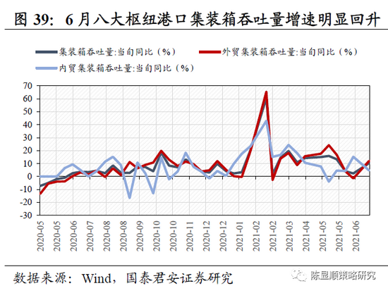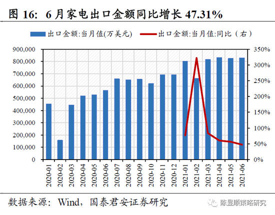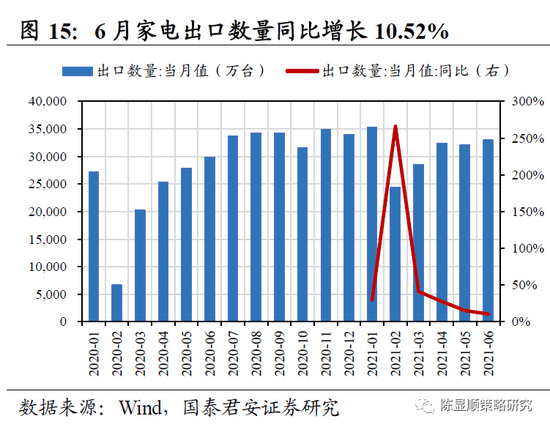 家电:出口增速持续回落。6月家用电器出口数量3.3亿台,同比增长10.52%,出口金额82.9亿美元,同比增长47.31%,出口均价小幅下行至25.14美元。整体来看,我国家电出口需求仍维持较高的景气度,但增速已逐步回落。