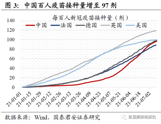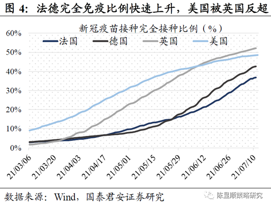 全球新冠疫苗接种速度放缓,法德完全接种比例快速上升。当前全球新冠疫苗接种速度有所回落,中美英法新冠疫苗每日接种量均出现大幅下滑。相比之下,德国疫苗接种速度保持相对稳定。截止7月12日,中国百人接种量增至96剂(+12.8),美国百人接种量超100剂(+3.05)。法、德完全免疫比例快速上升,分别为36.84%(+7.73pct)、42.66%(+7.09pct),英美完全免疫比例增长斜率明显放缓,分别为52.18%(+3.42pct)、48.24%(+1.89%)。