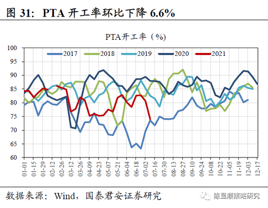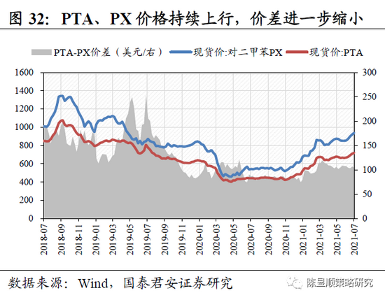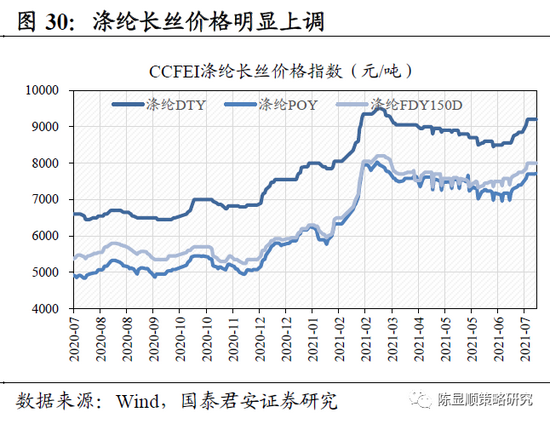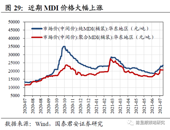 化工:MDI景气向上,涤纶长丝价格上涨。近期MDI价格大幅上行,主因美国、德国科思创等海外工厂相继发生不可抗力因素停产,致使货源相对紧张。截至7月13日,纯MDI报收23500元/吨,月环比上涨25.3%,聚合MDI报收20650元/吨,月环比上涨24.8%。下半年MDI将进入传统需求旺季,在供给偏紧叠加需求边际改善背景下,市场价格有望继续上涨。受下游秋冬面料备库影响,上周涤纶长丝价格明显上调,PTA受部分大厂临时检修影响,开工率周环比下滑6.6%,当前临检装置已逐步复产,市场供应基本恢复常态,预计短期供需中性偏暖,未来产品价格的核心驱动仍在成本端。