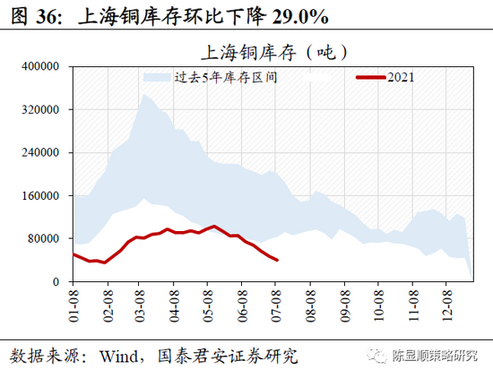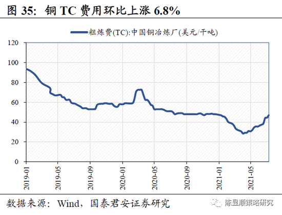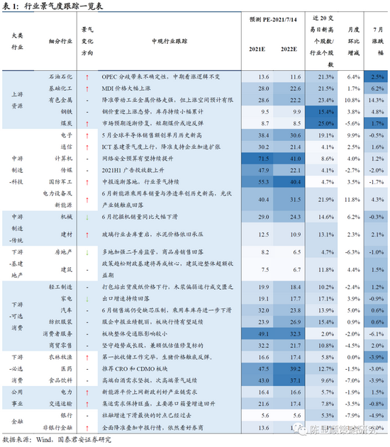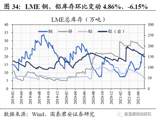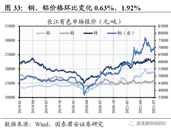 有色:央行降准驱动工业金属反弹,但上涨空间预计有限。截止7月13日,长江铜、铝、铅、锌报价环比6月底变动1.70%、1.97%、1.95%、1.82%。主因央行超预期降准刺激市场多头情绪,支撑工业金属价格。供需方面,当前市场逐步步入消费淡季,供给端迎来边际改善,随着智利、秘鲁疫情缓解,铜矿供应逐步恢复,铜TC费用环比大幅上涨6.8%。国内云南地区电解铝产能陆续复产,但蒙西地区限电或对电解铝产能造成影响。库存方面,铜、铝去库态势不变,沪铜库存环比下滑29.0%、,LME铝库存环比下降6.2%,库存持续去化有望对工业金属价格带来支撑,但考虑到美联储Taper压力与国内对大宗商品价格的管控,工业金属上涨空间相对有限,预计短期将维持高位震荡。
