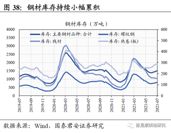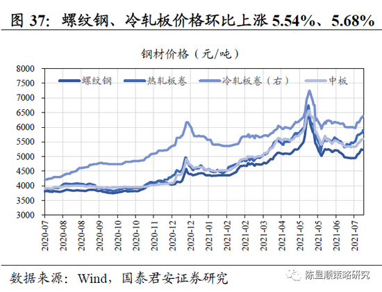 钢铁:钢价重迎上涨态势,库存持续小幅累积。受钢铁限产和央行降准影响,近期钢价持续上涨。截止7月13日,螺纹钢、冷轧板价格环比前两周上涨5.54%、5.68%。但受高温天气持续影响,行业阶段性需求淡季仍未结束,钢材总库存持续小幅累积,上周五大品种钢材社会库存上升29.63万吨,螺纹、热卷、线材等品种社会库存均有所抬升。当前钢材供给已接近峰值,且需求韧性较强,全年供需格局良好,钢价有望高位震荡运行。