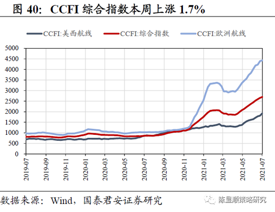 交运及公用事业:6月八大枢纽港口集装箱吞吐量增速明显回升,运价持续上行。6月下旬八大港口集装箱吞吐量同比增长10.3%,其中外贸同比增长12.1%,内贸同比增长4.6%,主要受益于盐田港全面复工复产,深圳港箱量回升。当前集运需求仍保持旺盛,运价持续上行,截止7月9日,CCFI综合指数报收2699点,周涨幅1.7%,CCFI美西航线、CCFI欧洲航线周涨幅分别达6.1%、0.9%。目前美国零售库销比已降至历史低位,未来补库意愿与节奏将是美线集运需求持续旺盛的关键。