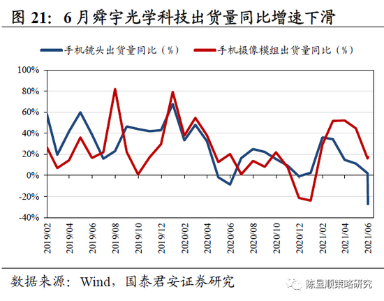 消费电子:苹果启动新一轮备货周期,果链供应商需求边际改善。受海外疫情及国内手机市场需求放缓的影响,6月各大光学厂商出货数据整体偏弱,舜宇光学手机镜头出货量同比下滑27.1%,大立光营收同比下滑18.5%。iPhone新机预期在3季度发布,苹果有望借此机会抢占华为留下的高端手机市场份额,Trend Force预估2021年iPhone出货量有望达到2.23亿部,同比增长12.3%。当前苹果启动新一轮备货周期,果链供应商积极招工扩产表明本轮iphone 13大概率增产。近期富士康积极招工,并将iPhone组装业务的员工返厂奖励提升至2010年以来最高。据Digi Times报道苹果芯片核心供应商Genesys Logic 和 Parade Technologies也在扩产以满足苹果订单。
