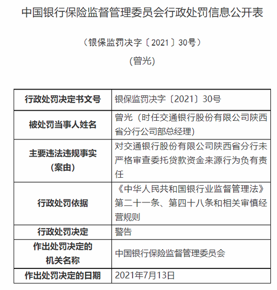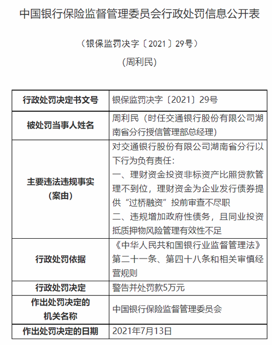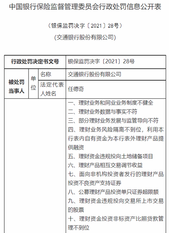交通银行表示,中国银保监会向我行下达的行政处罚决定书,源于2019年对我行进行的有关业务检查。交行将持续强化内控合规管理建设,厚植稳健审慎经营文化,不断提升经营管理水平,实现高质量发展。