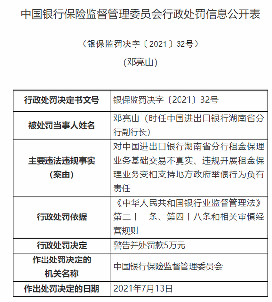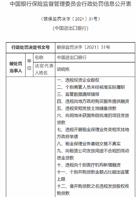 进出口银行表示,此次处罚是基于2019年中国银保监会对该行开展的风险管理及内控有效性现场检查中发现的问题作出的。