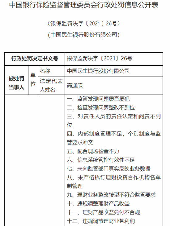 1、民生银行被罚超1亿元!因监管发现问题屡查屡犯等31条违规