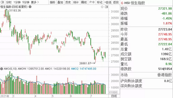 本周港股市场继续维持弱势,恒指一周累计下跌2.44%,报收于27321.98点。除了大市偏弱以外,本周部分板块及个股也出现了较大的波动。而从本周的交易来看,除了周四恒指取得了上涨外,其余几个交易日均为下跌。