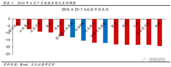2010年5-7月美股出现明显回调,三大股指均出现超过10%的下跌,行业间无差别下行特征显著。2010年4月的美股延续了2月以来的上行态势,但从4月下旬开始美股急转直下,至7月初实现阶段性企稳前经历了约2个月的下跌。从美股三大股指表现来看,2010年4月下旬至7月上旬标普500下跌16.00%,同期纳斯达克指数下跌幅度达到17.33%,道琼斯工业指数下跌13.55%,纳斯达克指数回调幅度最大。从行业表现来看,本轮回调期间,11个标普500行业中,通信设备、公共事业和必须消费呈现相对抗跌属性,跌幅分别为4.60%、8.03%及8.83%,同期能源、金融和材料板块领跌,下跌幅度分别为19.84%、19.51%及19.35%。总的来看,2010年5-7月美国回调时间较长,且无差别下行特征明显。