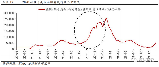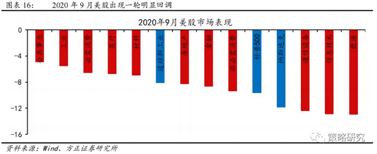 9月美股回调的催化剂是散户蜂拥看涨期权带来的杠杆风险集中释放以及市场担忧宽松的货币政策即将退出,疫情的二次爆发和欧洲各国的封锁措施引发美股二次回撤。杠杆风险方面,9月3日,美股在线交易软件Robinhood遭美国证券交易委员会的调查,未能全面披露关于出售客户订单/指令给众多高频交易公司的情况,而大量美股散户通过此交易软件买入看涨期权,一致性过高的市场共识在调查下风险集中释放,直接成为引发美股调整的催化剂。经济方面,劳工部报告新增就业岗位好于市场预期,美国经济恢复速度超预期,市场对于后续进一步宽松政策的退出的担忧加剧。据道琼斯调查的经济学家预期,美国8月份将新增132.1万个工作岗位,8月ADP就业人数环比增加0.36%,较上月提升0.18个百分点,且8月29日当周申请失业金人数也由前值101.1万人减少到88.1万人。对流动性最敏感的纳斯达克指数在此背景下大幅回调,信息技术和通信行业也进而带动市场整体走低。进入10月,美国疫情再度爆发,当日新增确诊病例斜率陡峭化提升,10月中旬的当日新增病例再度超过7月水平,再度引发美股回调。