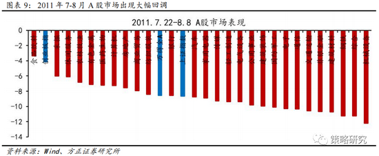 本轮A股随着美股市场同跌,市场整体回调幅度接近10%。从指数表现来看,本轮美股回调期间,上证指数、万得全A和创业板指分别下跌8.64%、8.54%及4.14%。具体来看,本轮市场调整期间,28个申万一级行业全部收跌。其中,食品饮料、采掘、休闲服务表现相对抗跌,分别下跌3.36%、6.00%及6.12%;同期机械设备、钢铁、建材领跌市场,跌幅分别达到12.20%、11.24%及11.23%,整体来看,消费板块具有更高的安全边际,周期板块回调幅度较大。从国内来看,尽管2011年以来我国通胀持续抬头,7月CPI数据攀升至6.45%,7月政治局会议再次强调坚持把稳定物价总水平作为宏观调控的首要任务,但本轮政策收紧周期自2010年已经启动,市场对紧缩政策预期已经充分消化,政策定调并非是A股市场调整的主要诱因,本轮回调美股和A股存在一定的联动性,美股大幅调整引起A股市场同步下行。