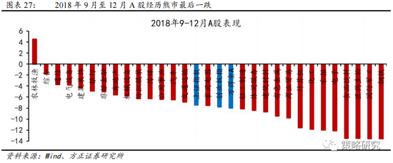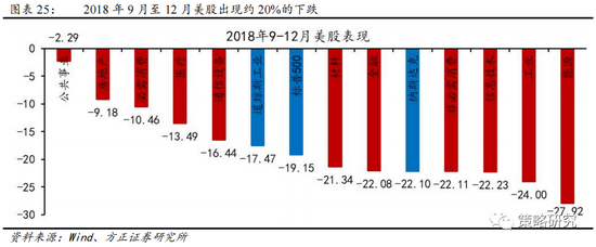 本轮美股调整期间,A股处于2018年熊市的最后一跌,美股走弱对A股风险偏好造成一定负面影响。在本轮美股调整期间,A股处于2018年熊市的末期,金融去杠杆+中美贸易摩擦是全年下跌的主因,而美股走弱对A股的风险偏好同样造成一定负面影响。具体来看,从2018年9月下旬至12月下旬上证指数、创业板指、万得全A分别下跌7.5%、7.8%、8.0%,三大股指无差别下行特征显著。从行业看,28个申万一级行业中,除农林牧渔外收益均为负,行业间依旧存在分化。其中钢铁、国防军工、医药生物、食品饮料跌幅位居前列,下跌幅度均在13%以上,而同期农林牧渔小幅上涨4.5%,主要是受益于猪周期的开始,通信、电气设备、建筑装饰同样相对抗跌,跌幅均在5%以内。总的来看,这一时期海外市场的调整对A股风险偏好造成了一定负面影响,但金融去杠杆、中美贸易摩擦不断升级依旧是市场下行的主要诱因。随着2018年下半年政策的由紧转松,在经历本轮的最后一跌后,2019年A股拾级而上开启新一轮牛市行情。